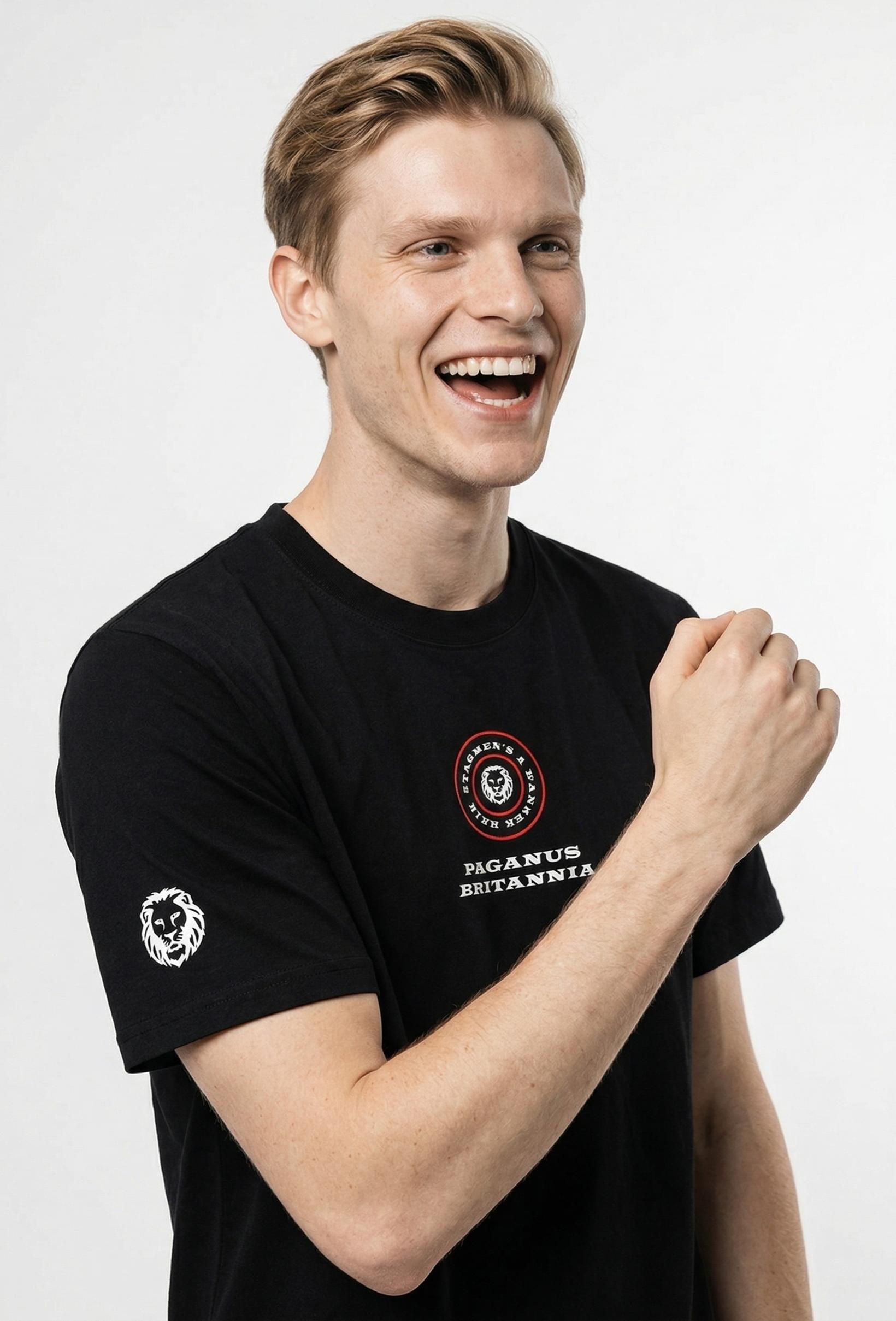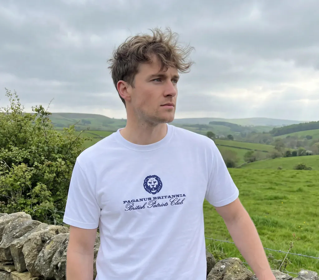 - 10cm white and red pure silk embroidery circular design to the centre of the chest with PAGANUS BRITANNIA logo under main design