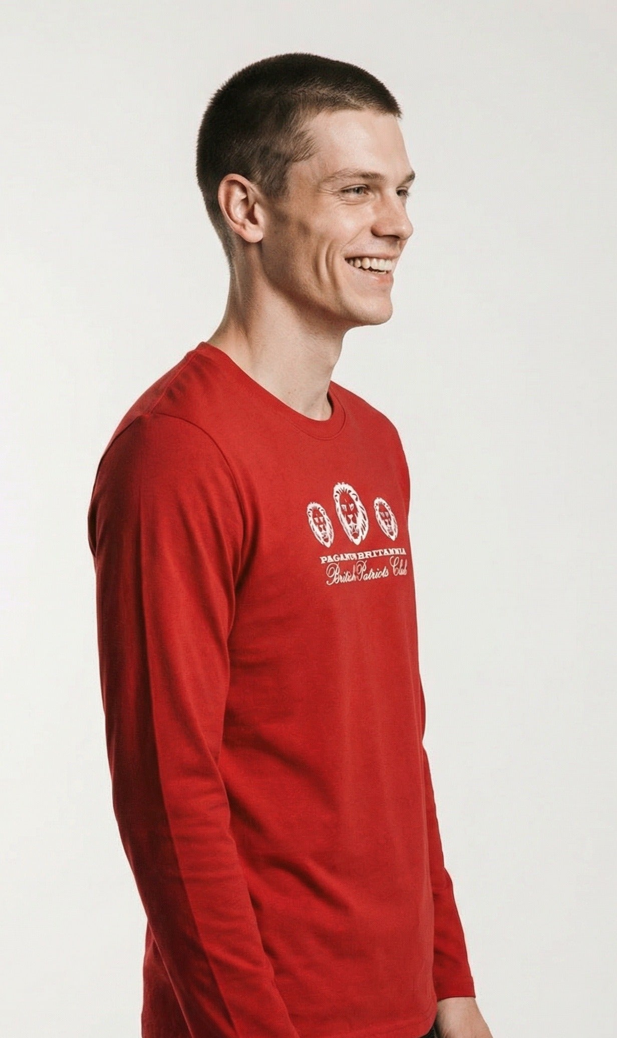 Introducing the English Patriots Club Three Lions Long Sleeved T-Shirt in red.. A luxury long sleeve t-shirt crafted with a regular fit from medium heavyweight 240gsm soft to the touch combed cotton. The t-shirt has a ribbed crew neck collar, with stunning English Patriots Club 24cm white embroidery design to chest with 3 roaring lions. It is finished with 5cm St George flag embroidery to both cuffs.