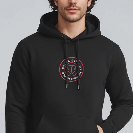 Black heavy 360gsm cotton hoodie. 10cm Never Give Up embroidery design to chest.