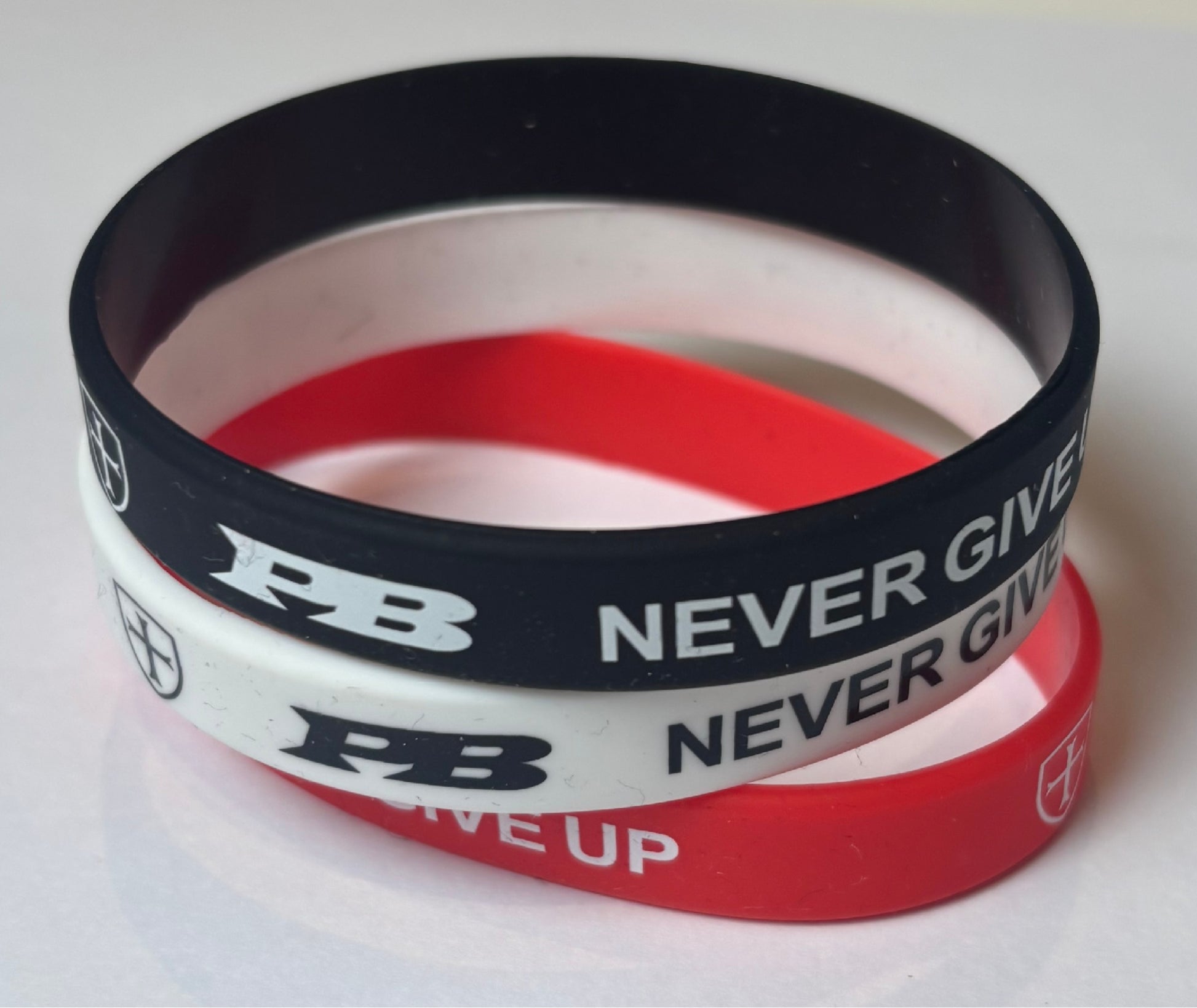 3 x bracelets. Red, white & black 202mm length silicon stretchy bracelets, easily fits all normal adult (male and female) hand/wrists sizes. Double Paganus logos with NEVER GIVE UP text.
