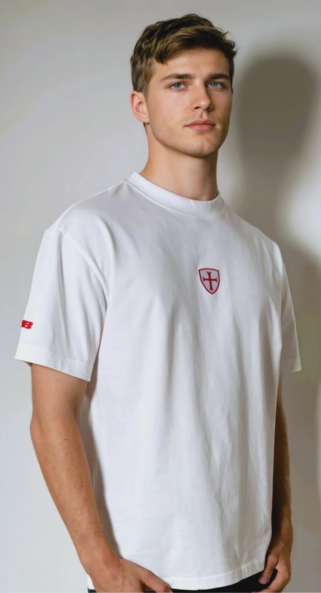 White 260gsm organic combed cotton t-shirt with shield logo.